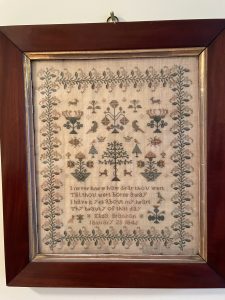 I’ve been preparing for my trip to England in April by opening boxes of photos of my English relatives, and finding files online. Oh my, there’s a rich trove of material; the family tree is coming clear, and you’ll hear all about it when I’m there. School House, the thatched cottage where Mum was born, was built in the late 1600’s; she grew up with an outdoor toilet, no electricity, no hot water. Her sister Do gave me this beautiful needlepoint sampler embroidered in 1846 but wasn’t clear who Eliza Branson was. I now know: Elizabeth – Eliza – Branson was my great-great-grandmother, probably then a teenager. How thrilling is that?