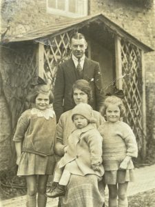 Percy and Marion outside School House with Margaret, Dorothy, and on her knee my chubby mother, who weighed 10 pounds at birth and grew to be six feet tall.