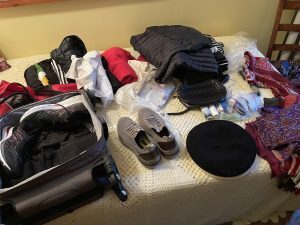 It’s always like this the week before departure on an extended trip — frantic. The guest room bed is covered with possible clothing choices.