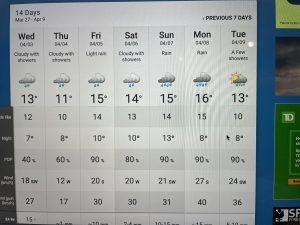 I’m working through the lists – got my taxes to John, took in some jeans to be hemmed, got the key to Alanna who’s moving in mid-April, got my hair cut not my neighbour but by an actual hairdresser, Annie came for dinner yesterday to say goodbye … The audiobook will not be finished, Patrick is having computer problems, so it’ll wait.