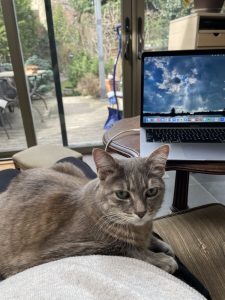 I thought about my cat last night – about any pet, totally in the moment, no worrying about the future. A good way to live. British writer Muriel Spark once said, “If you want to concentrate deeply on some problem, and especially some piece of writing or paper-work, you should acquire a cat. Alone with the cat in the room where you work, the cat will invariably get up on your desk and settle placidly under the desk lamp. The light from a lamp gives a cat great satisfaction. The cat will settle down and be serene, with a serenity that passes all understanding. And the tranquility of the cat will gradually come to affect you, sitting there at your desk, so that all the excitable qualities that impede your concentration compose themselves and give your mind back the self-command it has lost. You need not watch the cat all the time. Its presence alone is enough. The effect of a cat on your concentration is remarkable, very mysterious.”