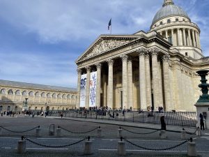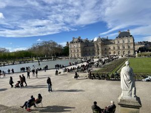 And then I went to the river to check – yes, there she is in the distance, Our Lady, with a new spire. I’ll visit her soon. I was here when she burned, went next morning to bear witness and mourn with the crowds. I wept twice on my first walk today, once for Dad, and once for Notre Dame.Wandered back, poking about, and was so woozy, I had to lie down for a bit. But it was lovely out, so I walked up the rue Claude Bernard, where I used to rent a friend’s little pied à terre when I visited, to the magnificent Panthéon and then to the Jardins du Luxembourg, packed with people, especially children, on this holiday Monday. And then got the #21 bus back, stopped to get some take-out Vietnamese soup to eat in my room, and got myself organized. And now to bed.Photos: plane trees for Ruth! Dad’s cherry tree. Notre Dame in the distance from the Pont d’Austerlitz. Every tree in the city has a little garden planted around it; the greenery everywhere is extraordinary. A very small, ordinary grocery store and its liquor for sale, including Veuve Clicquot. How they honour their national heroes in this country, with a humble little monument – the Panthéon. The Rue Soufflot with the Eiffel Tower in the distance. Luxembourg – these people know how to do parks; thousands strolling and sitting in the sun. Loved the little boy – surrounded by beauty, he played for 20 minutes dropping pebbles down the drain. As my grandboys loved to do.Bonne nuit!