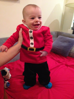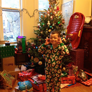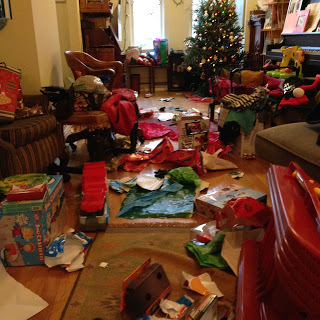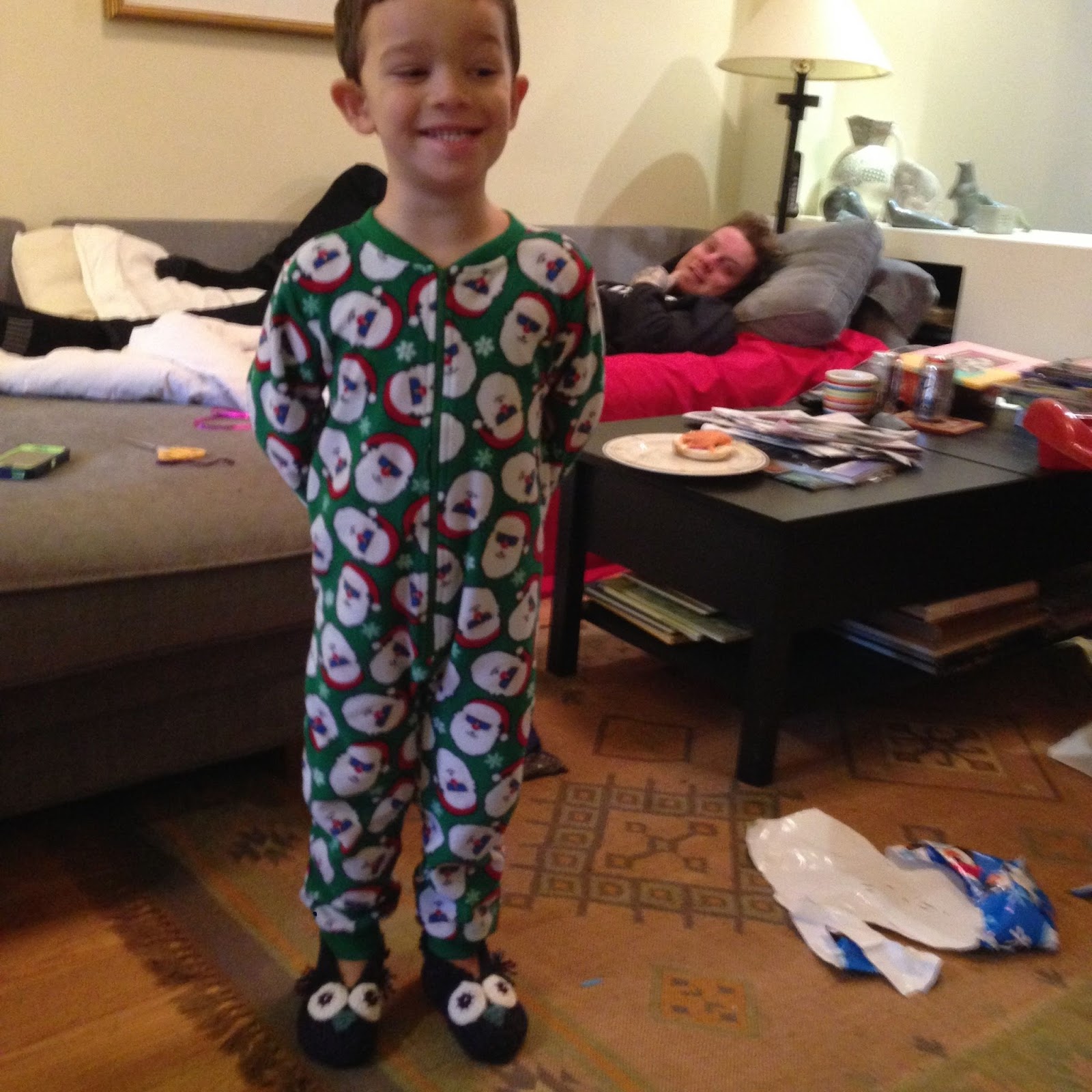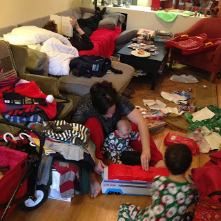two hours later: general chaos, and one tall man reading his new book on the sofa amidst the mess. Then he went back to bed. Notice: grandsons in matching Xmas sleepers.