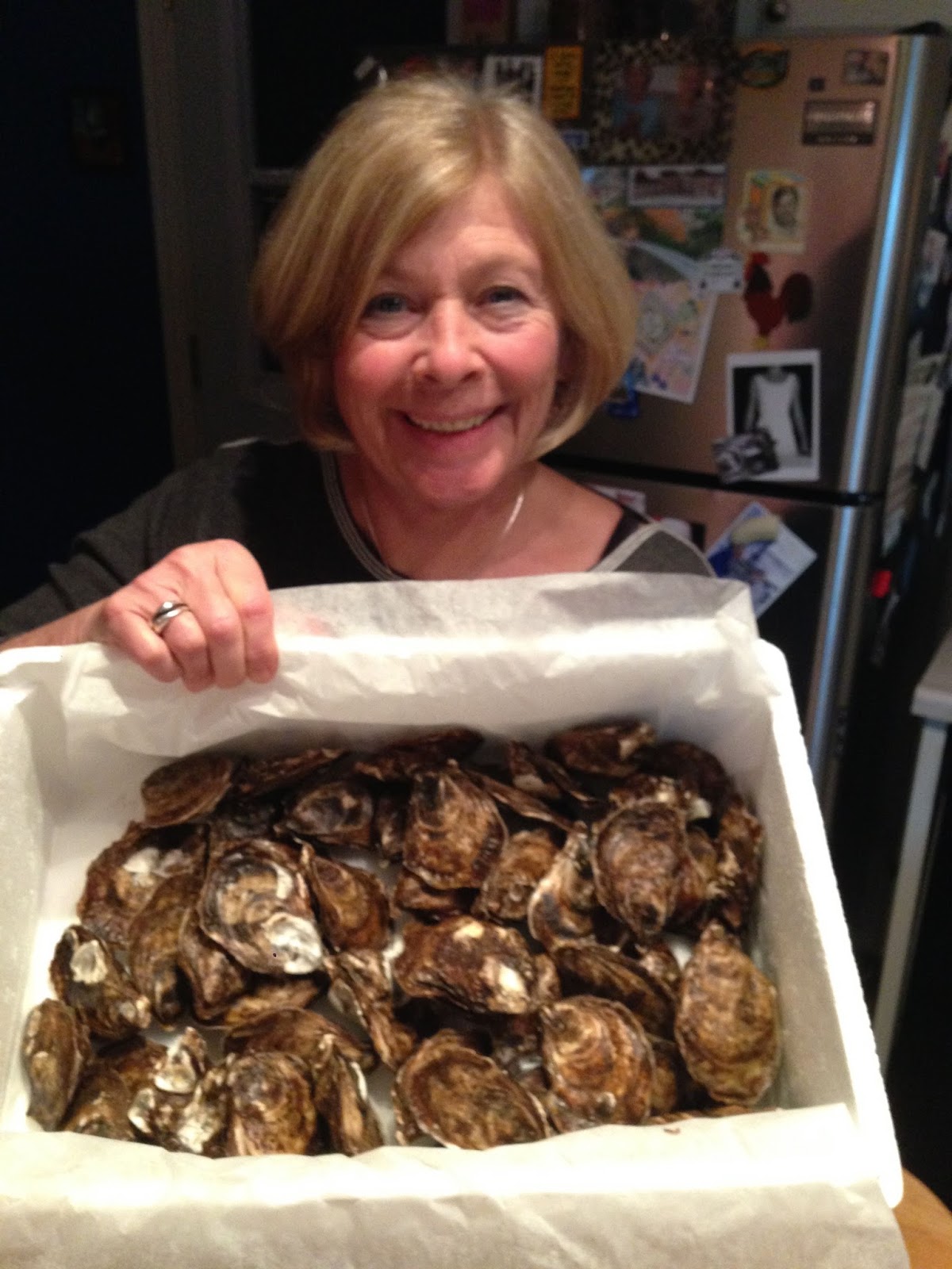 Emilie's lovely mother Lorraine with our oysters for the evening, from my brother's gourmet seafood emporium La Boucanerie de Chelsea. We also had fantastic cheese, calamari salad and smoked and baked salmon. And Ben devoured his first shrimp.