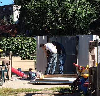 Here's my daughter's Sunday: I bought a shed in a box for her at the Cabbagetown Festival, but looking inside at the incredibly complicated instructions and hundreds of bits of metal, I thought we should just shut the box and sell it again or give it away - which is what the guys we bought it from had done. But Thomas, Eli's Dad, read the instructions carefully and began, spent all yesterday afternoon, and today with a friend, putting it together, with Eli playing at his feet. I can't imagine what it would be like to have a father who can do practical things. Mine knew many things but could do few things with his hands, besides play the violin. Wonderful to have a skilled man in the family.