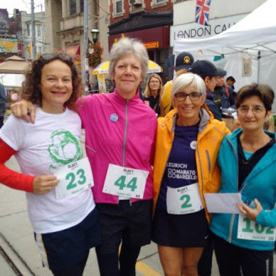 The winning Senior Women of the Cabbagetown Mini-Marathon: 4th, 3rd, 1st and 2nd. Gina wearing the cabbage had two very small grandchildren running too, and the one with the anti-Harper button hopes to run with her older grandson next year. Proud of us, girls!In fact, I don't think any other senior women even enter this competition - only, year after year, this sleek bunch of gazelles. You do understand I am a very slow runner, right? That every year, in the middle of this very short race, I wish I'd done even a little bit of training. And yet there I am in the winning circle. No one is more amazed than I.