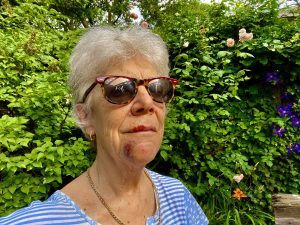 This is last Wednesday; on Thursday the bruises on lip and chin got even darker. And now, a week later, completely gone. Bodies are amazing! My knee is still throbbing with a big red scab, but the scabs on my hand are falling off. I had x-rays yesterday on ribs and knee. I’m sure all is well but it’s good to check; my ribs still hurt. Was lucky enough at the x-ray clinic, at 8.20 a.m., to sit next to friend and former writing student Merrijoy, who’s a vibrant 96, indefatigable, off to Stratford today. We all need such inspiration in our lives.