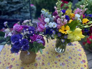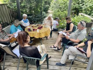 Sadly two people had to drop out due to illness, so there were nine writers here for the day, ranging in age from a recent high-school graduate to an artsy business owner in her eighties. We had perfect weather, some cloud, not too hot, and it was very quiet. Much intense discussion about many things. Careful listening, powerful writing, laughter, camaraderie. One of the writers mentioned his book, to discover that another person there was on the team that published it. Other bonds: small towns, English parents, anxiety, difficult mothers, fathers who died too young. And more. One made a startling on-the-spot discovery about her mother’s sexuality. We all exclaimed with her.
