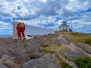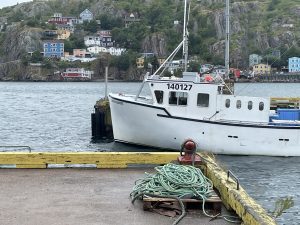 Today after putting everything I might conceivably have breathed on or touched into the washing machine, with my sheets already hanging on the line, she drove us to St. John’s. We went up Signal Hill, a military lookout overlooking the city and the harbour where Marconi received the first transatlantic telegraph signal. The wind up there was so violent, it almost knocked us down, I had to grab a handrail not to be pushed over. Then to Quidi Vidi, a pretty fishing village close to town that’s overrun with tourists, where we had lunch – fish and chips for her, delicious lobster roll for me, with, of course, beer. She had two pieces of fish and could only eat one, so I wrapped the other and took it with me. It’ll be lunch today.