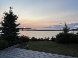 We watched two episodes of a fun British series called Ludwig every evening while eating Annie’s chocolate cake. Annie swam far more than I, but I swam twice a day, and before and after the weekend we swam without a suit as there’s hardly anyone on the lake. A. and I kayaked twice. We cooked healthy meals – last night shrimp with rice and baked sweet potatoes, sweet and sour red cabbage salad, and of course the cake. We drank gin and tonic and rosé. We laughed a lot and worked hard at the NYT’s Spelling Bee. A. and I walked twice, forest bathing around Ruth’s island with our socks over our pants because of ticks. We listened to a Lockdown University webinar about memoir with Denis Hirson, to see if I could learn anything new. I didn’t, but Denis said things in an interesting way that I will steal.