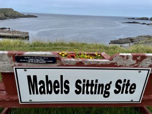 Below: the village of Grate’s Cove with Finn, Cathy’s little dog, leading the way; Cindy’s; “In honour of Mabel Driscoll. Here she sat watching the comings and goings of fisherman”; the fishing village of Bay de Verde, pronounced Bay de Verd.