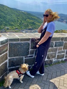 Below: so many beautiful old churches and graveyards. Dusk on Kath’s deck. Quidi Vidi. Kath and Finn in the wind on Signal Hill.