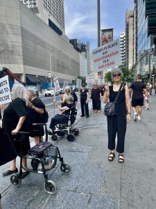 Friday afternoon Annie and I stood at Bloor and Yonge with the Women in Black; Michele Landsberg has organized the Toronto chapter of women who dress in black and attend a silent vigil to protest the genocide in Gaza. There were at least 100 women, although as someone laughed, asking 100 women to be silent is a non-starter. There was much talk. But a great seriousness of purpose.