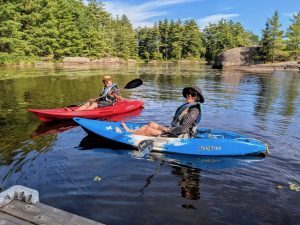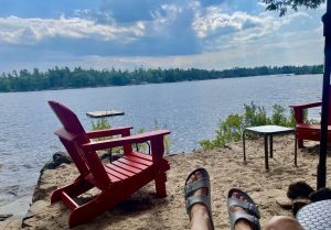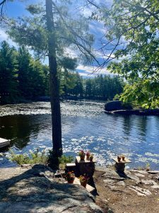 I’m at Ruth’s cottage, built on massive Precambrian boulders of Muskoka granite, breathing air scented with pine, listening to the warbling of the loons. Yes, we are also invaded by cockroaches and ants, and there are occasionally dock spiders in the kayaks. The weather switched on Sunday instantly, from hot to cold and back again. But it’s heaven.