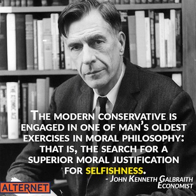 My hairdresser, who's a dear friend, told me that several of her clients are Harper supporters. Terrifying. Thank you, John Kenneth Galbraith, one of my heroes, for nailing the issue for once and for all.