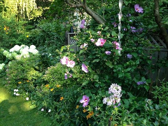 8.30 a.m. Sunday morning, quiet and fragrant and blessed. The garden is moving into its mauve period - phlox, rose of Sharon, lavender - with a pop of yellow rudbeckia, the white balloons of hydrangea and the giant toppling golden glow behind. I thank you god for most this amazing day ...