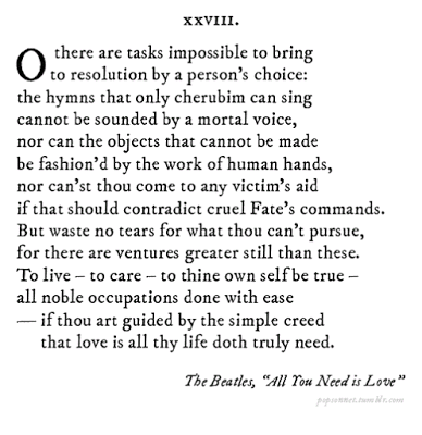 There's a wonderful website, Pop Sonnets, that does Shakespearean versions of well-known pop songs - very clever and skilful. Your morning smile.