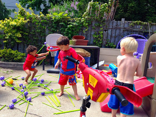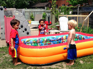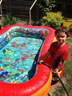 I hope you'll indulge me, dear readers. My grandson was three today, and his birthday was a grand celebration which I share, below, with you. His real party is on Saturday; this was just a small event with his best friends Finn and Marcus. Imagine, having two best friends before you're three. My daughter's backyard is better than a playground, just full of toys, the hangout for lots of local kids, which is fine with her. Now more than ever, I'm sure - because my gift, which had been requested, was a large wading pool. They spent some time filling it up and the rest of the afternoon emptying it - scooping water out and splashing. The pool, believe it or not, has 3-D fish on it and 3-D goggles so you can appreciate them.