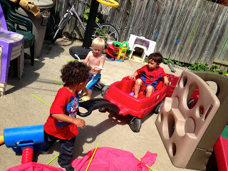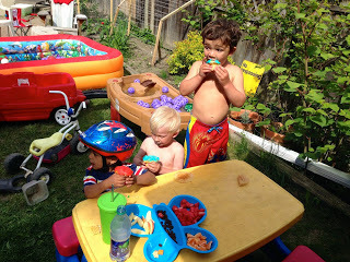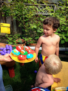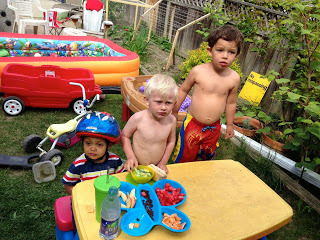 Saturday was Eli's actual birthday party, and once again, I take my hat off to my daughter, who's a lunatic but a wonderful one. By the time I left, exhausted, there were in her backyard at least 15 children under the age of ten and their parents - relatives, friends, neighbours, with ever more arriving. The kids were all busy with various activities, and Anna fed everyone. Eli was swimming in gifts and two birthday cakes. He is a lucky boy. Apparently, speaking of lucky, Anna's 3 best friends cleaned up.