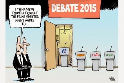And - here's the best political cartoon of recent days. For those of you not in this country, our esteemed Prime Minister, when an armed gunman broke into Parliament, ran into a broom closet to hide. And now, in the run up to our national election, he has refused to participate in most debates.