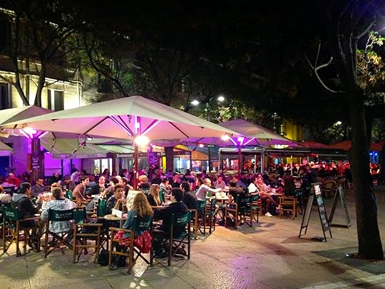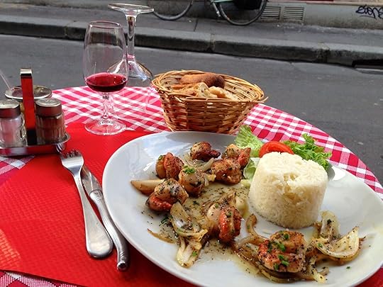 Dinner on the rue Mouffetard - grilled scallops with rice and bread and two glasses of wine, with a fantastic street view in the fading sun, for under $30.