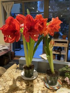 The amaryllises Ken and Annie brought me a month ago are in full blazing bloom.