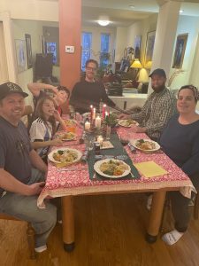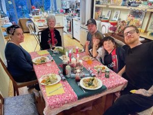 And then dinner, with our special treat, the presence of both Thomas, Eli’s dad, and Matt, Ben’s dad, chatting amiably together. Both fathers treat both boys as their own, which is a glory to see, all of it a tribute to Anna who somehow engineered this familial miracle. Thomas brought his Xmas baking, four different kinds of rich treats. We feasted.