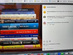 And in the middle of all this, one of the best gifts ever: I discovered Midlife Solo is on the list of Ben McNally Books’ top ten bestsellers for November. Imagine, my book and the word ‘bestseller’ in the same sentence — and with the marvellous Roz Chast! It’s only there because the book launch was in November and sold a lot of books, but still, for now, it’s there.