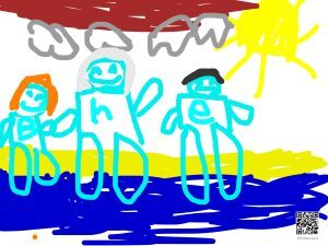 Ben, like David Hockney, drew this on his iPad — Ben with the long hair has a B, Eli has an E, and someone big with grey hair has an H. Unlike our real world right now, there is sunshine in Ben’s. Happiness is!