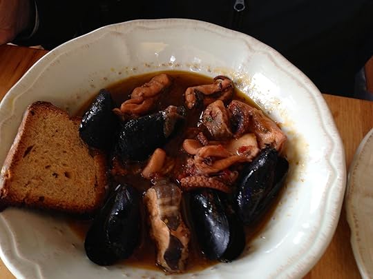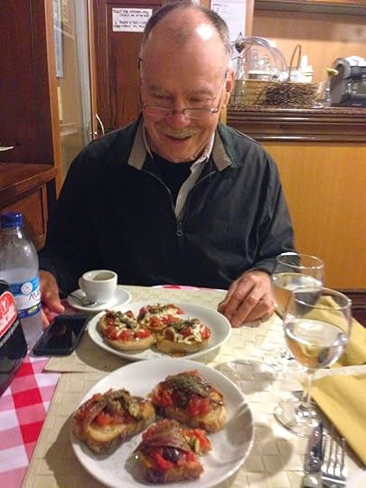 But he did look at lunch, at the lovely Cantina del Pescatore I'd read about in TripAdvisor - a simple lunch of divine bruschetta - could I live on bruschetta? Yes I could if the tomatoes came from Italy. Mine had olives and anchovies caught here. Then tiramisu and espresso for dessert.