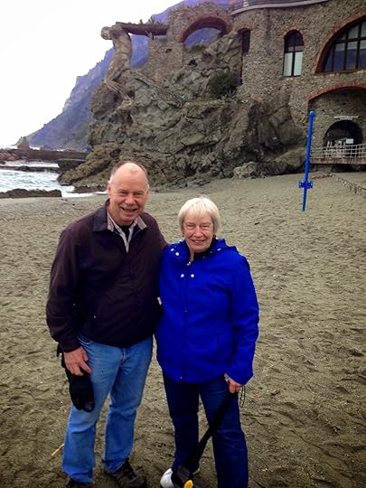 On the beach in the drizzle - there's a sculpture in the background carved out of the rock face of a man holding something up. We met Maryann, who it turned out lives in the West End of Vancouver three blocks from Bruce. Coming to Italy has been her lifelong dream. "See you in the Safeway!" he called as we left.