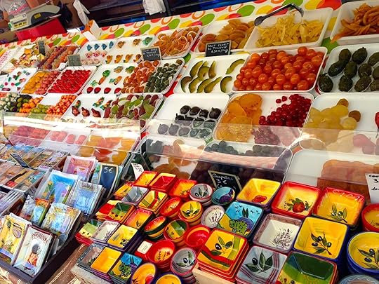 But first, my Tuesday morning in Nice, where by noon it was full-on summer and the beaches were filling up. Sadly, as I’ve said, I could not visit Matisse or Chagall, as all the museums were closed – I had to stroll along the Promenade to the old town, visit the flower market, and buy piles of lavender as a gift. Found a hardware store that had been open for more than a hundred years, and from the clerk – who’d been working there 50 years – I attempted to buy a classy French chef’s knife for my son. But he advised me that it’s not done to buy knives as gifts, so I bought Sam something else, and something for Anna, and found other gifts. A good time. Sat on the beach in the hot sun to eat lunch of the bun I’d made from what was offered at breakfast. Back to the hotel to get my suitcase and to the train station, for a painless journey, again along the Cote d’Azur and then up into Provence. Well, almost painless. First I got on the wrong train and had to rush off, and then when getting off my own train I almost forgot my backpack. But otherwise painless.