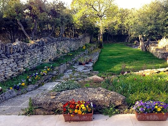 Lynn and Denis's garden in Gordes. Very old stone fence and many olive trees.