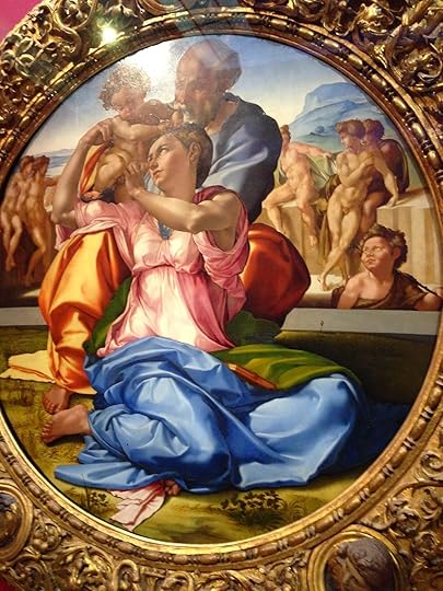 A miscellaneous Michaelangelo. Ha, not miscellaneous at all. Bruce knows that the Uffizzi is easy to get into at 5 - and sure enough, no line. He gave me the hour and a half tour of masterpieces - incredible. And I resolved not to photograph anything, it was all too overwhelming. But this - I had never noticed that Mary has a book in her lap. She's often portrayed in the Annunciation pictures reading, before being interrupted by the angel to tell her she's miraculously with child - hello little sperm bird! - but here she's a busy mother with a very solid bambino and still, trying to get a little reading done. So beautiful.