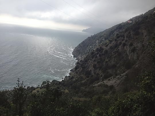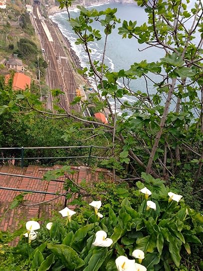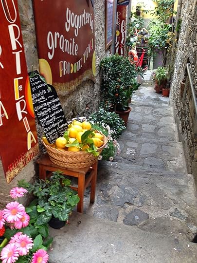 And somehow we just kept going, eventually, even though the sky was heavy and dark and it threatened to rain. And then there was more light and even a bit of sun, and incredible views of the sea and Vernazza behind us, and we met a few others on the trail - not many, because the weather was so iffy - and we just kept going. An hour and a half later, after several almost vertical climbs - up up up to the heavens and then along and then down down and down - we arrived in Corniglia. A woman on the trail had told us about a place that made great crepes served with fresh lemon juice, which my mother used to make for us, and we found it and dug in. The taste of home! Lemons falling from the trees everywhere here. Explored the town and then headed down a million stairs to the train station for the 40 minute wait, staring at the sea, to get back. An hour and a half up and downhill to get there - a two minute train ride back.