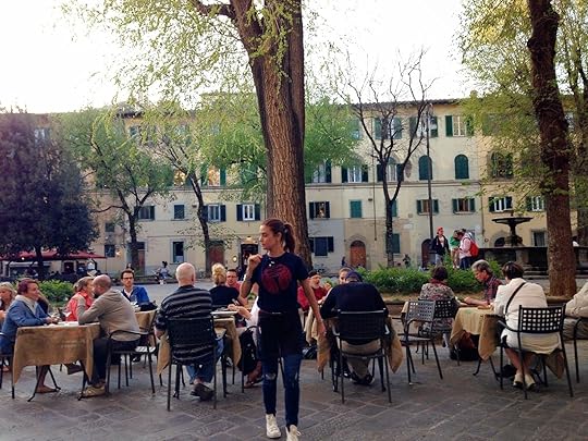 It was wonderful not to do much in the latter part of the day - after so much walking, my feet hurt, and I'm worn out by so much beauty. Had a glass of wine in my room in the sun, but finally, at 7.45, needed to go and find some food. Through my on-line trolling, I'd learned that the Piazza Santo Spirito, on my side of the Arno, the left bank, was a happening place, and in the Guide du Routard I found a place there that sounded good. So headed off, in a city of thousands of restaurants, to find one, along the narrow streets, trying not to get hit by bicycles, cars, busses, passing ancient churches, tall magnificent old buildings, artisan workshops, countless trattorias.