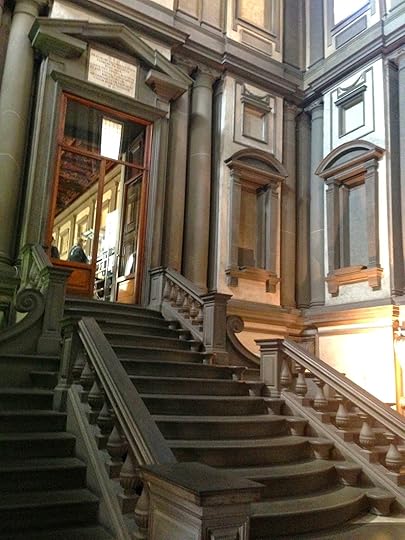 The Medici Library - the books were kept under the desks, chained to them. Below, the library staircase designed in 1524 by Michelangelo. Grey sandstone. Very stern and angular.