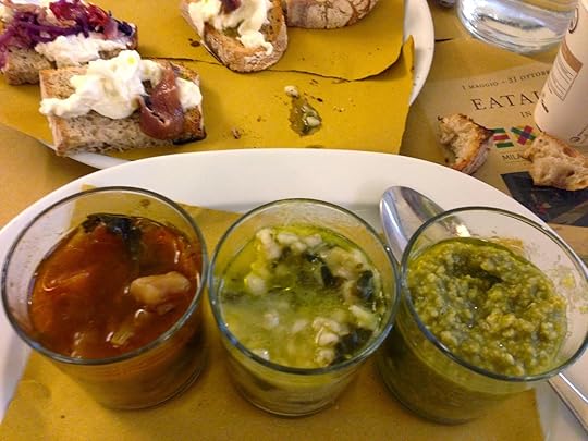 Lunch at Eataly - the soup tasting menu, with the bruschetta tasting menu in the background. Loosen the skirt a little more.