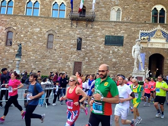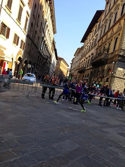 Thrilling - you can't see them, the frontrunners from Kenya, except for their lime green shoes, they went by so fast. After looking at all those stunning bodies in marble, here were stunning bodies in ebony - divine running machines, many minutes ahead of their human rivals.