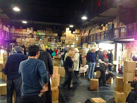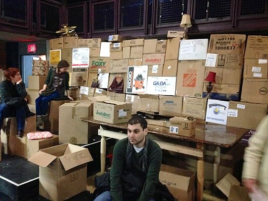 Then we sit on various boxes and bits of furniture as Mr. Sobelle assembles his playing area, pulling lamps, a rug and furniture out of boxes - shoving audience members politely aside to do so - and our journey into memory and possessions begins. It feels as if we are travelling inside his life and his memories - he tells us about a week of his young life, a traffic light that he saw in the distance, then that much later he saw the same traffic light only now he was on the other side of it, older - and then he pulls the actual traffic light out of a box and it works, so we all sit bathed in the coloured lights he has just described. He puts on skates, courts a woman in the audience, and makes her a salad on a table top, chopping lettuce and peppers by stomping on them with his skates - then does a hysterical tap-dance, in skates. He gets women in the audience to empty their purses and detail what's in them. And at the end, he does an incredible, inexplicable magic trick - he pulls out a flat box, shows us it's empty, tapes the bottom carelessly, and then proceeds to pull an enormous quantity of stuff, bit by bit, from this box - showing, we soon realize, the whole span of a life. Young man on the make, young husband, then he pulls out diapers and baby toys, then bills, on and on - armloads of books, chunks of brick, and at the end pill bottles, slippers, and chunks of wiring that look like our insides. And then the lights go out. Needless to say, tears were running down my cheeks.