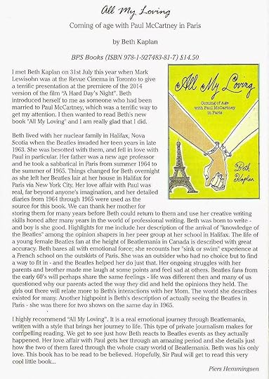 Thrilling - Piers Hemmingsen, Canadian Beatles' expert who has a new book coming out soon himself, sent a review of the memoir to the British Beatles Fan Club Magazine - a huge resource for Beatle people - and it just came out.