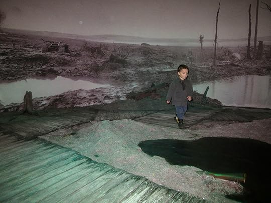 A small boy at the Battle of Passenchendaele - background at the War Museum in OttawaAt the end of our more than five hours on the train today, the woman across the aisle took Eli's hand and said, "You were such a good boy - are you always so quiet?" My jaw dropped and I said, "Really?!" It was a long hard journey for a small boy with a bad cough who'd been through the wringer - back and forth, several beds, many relatives, not nearly enough interesting places to climb. The whole trip is a blur; we were at the centre of a tornado - Hurricane Eli. But he WAS a good boy, if exhausting, stubborn and extremely opinionated. How can someone who wasn't even on the earth 3 years ago be such a fierce and commanding presence? But then, he's his mother's son, and the force of her personality shone through from birth.