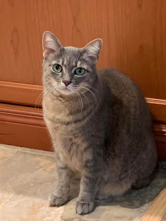 My childhood cat was grey, perhaps that's why I responded so immediately to her pic. My father named all our pets after Greek goddesses, so he named her Ariadne, and I named her Wusso. I adored her. We had a rule — if you had a cat in your lap, you didn't have to get up to do chores. You could call, "I have a little grey visitor," and my mother would leave you alone.