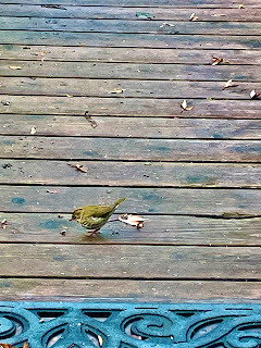 Today's thrill: a fat little ovenbird pecking away on my deck. I'm concerned; he should be flying south with his team. Instead, he's hanging around my back door, with his spotted thrush breast and a lovely orange stripe on his bean. He's a warbler but I have not heard him warble. Honoured to host you, little friend.