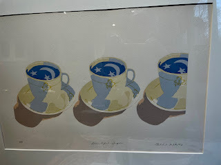At home, my very own Gathie Falk print, teacups and stars; she donated it as a fundraiser for a Vancouver theatre, my parents bought it, I inherited it. Delicately pretty. More sun today. Sam wrote that he just went to pick up his dog's heart medication; on the bottle was printed "Bandit Dobie." The responsibilities of fatherhood. He's learning the hard way.
