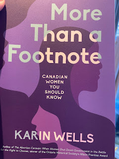 I was there to pick up my friend Karin Wells's new book, More Than a Footnote: Canadian women you should know. Karin was a roommate in my first apartment in 1968 and in 1970 became a professional actor at the same time. I bought her book not only because I admire her as a broadcaster and writer, but because she dedicated the book to my daughter Anna, among others. She told me she'd heard a great deal about Anna's activism and generosity and wanted to be sure she was included as one of the young "Canadian women you should know." Proud mama here.