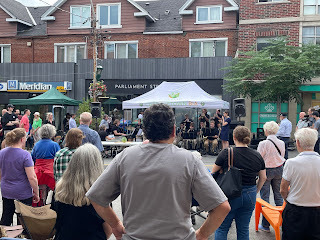 OVERJOYED, as always, to be home. My friend had misunderstood my request and hadn't watered, so the garden had been four days in great heat with no water. But survived. I went right out again to the concert ending the Cabbagetown Festival, the big band I'd loved last week, playing to crowds on the street. They played God Save the King, and everyone stood up.