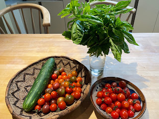 Yesterday's harvest - pesto and sauce coming. I will have lots of green tomatoes. It's still very hot today, but the leaves are turning. We're here, my friends. We're still here.