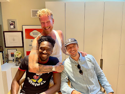 This photo is a special thrill: Sam and two of his best friends from high school were over yesterday. Their school wasn't far so the bunch of them spent a lot of time here, so much so that these two call me "Mum" although they have serviceable mothers of their own. They're now in their late thirties. Duston is a hard-working man who supports his mother, his daughter, and two teenaged godchildren he adopted when their own parents dropped out of sight. He has managed to buy several rental properties. Tristan is an artist in special effects in films, was nominated for an Emmy and was at the Emmy awards last week, recently got married. And Sam is figuring out a new way to live, now six months sober after many years of drinking, some of them with these guys who also hardly drink now.