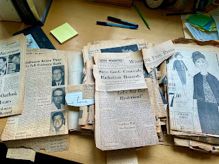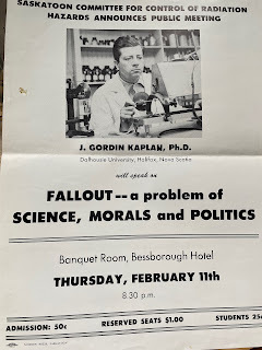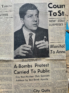 Made the mistake of opening the box marked "Dad." Now overwhelmed, fingers dusty from newspaper clippings from the 50's on - my father's career as, as one paper put it, "a Ban the Bomb apostle." He started in Halifax, where the U.S. was actually, believe it or not, dumping nuclear waste off the coast of Nova Scotia, and subsequently spoke across the country and wrote many articles. There's one long, beautifully written and funny editorial published in May 1958, entitled "Radiation causes cancer, mutations," refuting a recent speech by the Vice-Chairman of the Defence Board of Canada, who said nuclear fallout was no danger at all. My father obliterates that argument.
